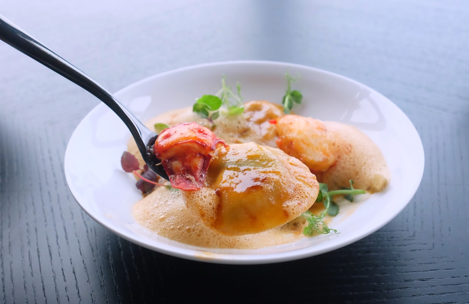 Ravioles de homard bleu imprimées d’herbes ($680),藍龍蝦香草意大利雲吞。店方自家製的香草意式雲吞皮爽滑,包著以龍蝦肉及軟羊奶芝士餡料,及伴以龍蝦濃湯,味道鮮美香濃。